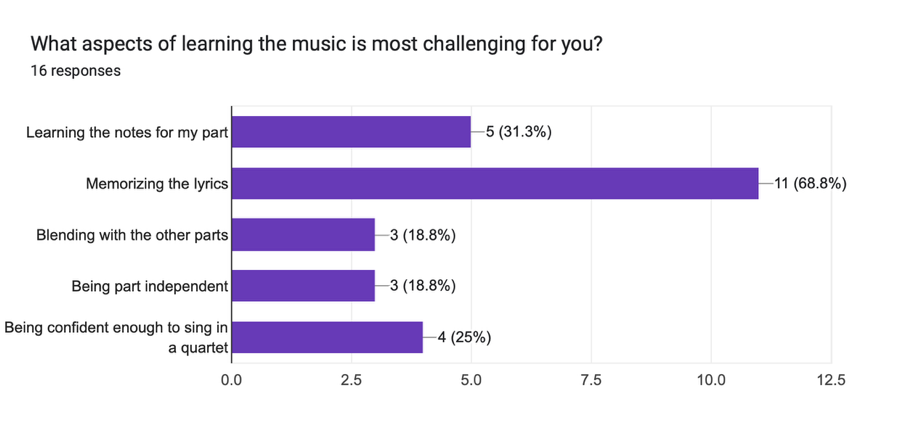 Thank you to the 11 members who filled out surveys before rehearsal last night! It’s good to know that you are responding so well to this project. We had a lot of comments tonight that showed your commitment to learning the music.